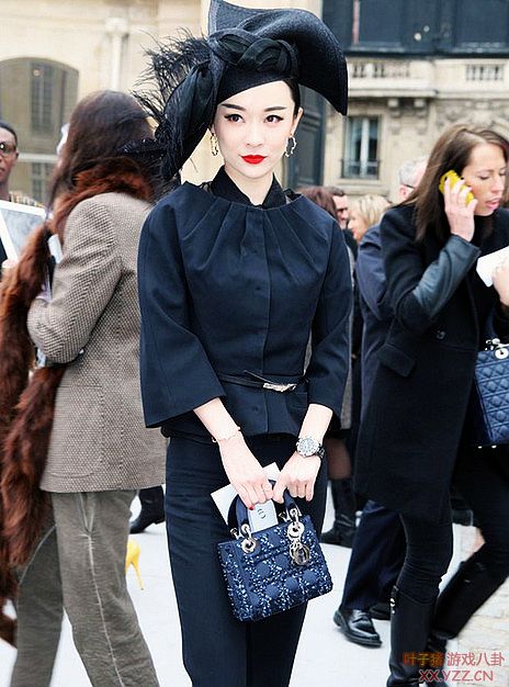 摇身一变,已经成为时尚界的新星!一身黑套装,复古帽,手拎Lady Dior包很是抢眼。